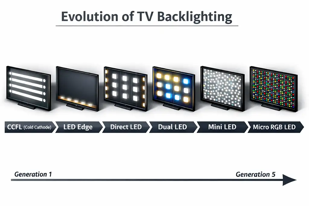 Die Micro-LED-Hintergrundbeleuchtung ist das Ergebnis der fortlaufenden Weiterentwicklung von TV-Hintergrundbeleuchtungstechnologien und kann als die fünfte Entwicklungsstufe betrachtet werden. Die erste Generation basierte auf Kaltkathoden-Leuchtstofflampen (CCFL). Darauf folgte die LED-Edge-Hintergrundbeleuchtung, anschließend Direct LED. Später kamen Dual-LED-Systeme hinzu, bei denen eine blaue LED in die Hintergrundbeleuchtung integriert wurde. Danach folgte die Mini-LED-Technologie, bei der größere LEDs durch kleinere ersetzt wurden, um die Anzahl der Lichtquellen zu erhöhen und die Helligkeitssteuerung zu verbessern. Die Micro-LED-Hintergrundbeleuchtung stellt den nächsten Schritt dar und nutzt drei separate LEDs – rot, grün und blau.