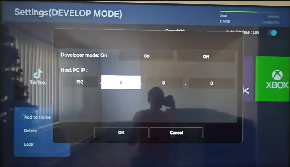 Um den Entwicklermodus zu aktivieren, gehen Sie wie folgt vor. Öffnen Sie den Bereich „Apps“ auf dem Fernseher und wechseln Sie zum App-Store-Bildschirm. Gehen Sie zu den Einstellungen. Wenn das Zahlenfeld erscheint, geben Sie auf der Fernbedienung die Sequenz 1, 2, 3, 4, 5 ein. Danach öffnet sich das Developer-Mode-Menü.