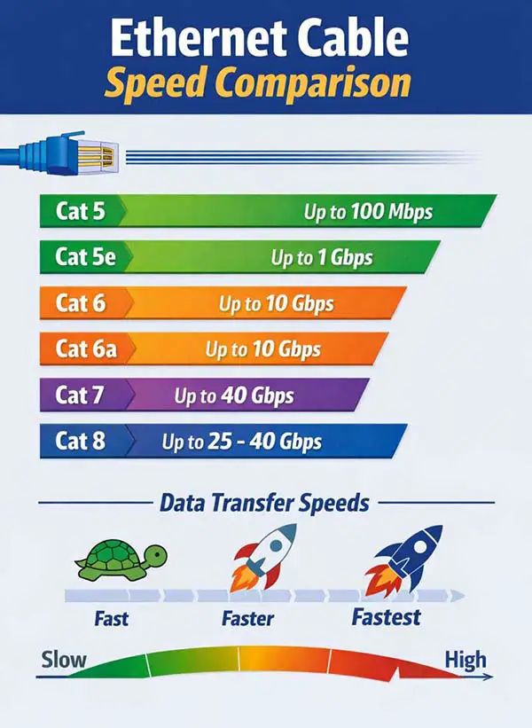 Für den Heimgebrauch sind in der Regel Cat 5e- oder Cat 6-Kabel ausreichend. Cat 5e unterstützt Geschwindigkeiten von bis zu 1 Gbit/s, während Cat 6 über kurze Entfernungen bis zu 10 Gbit/s verarbeiten kann. Höhere Standards wie Cat 6a, Cat 7, Cat 7a und Cat 8 sind für den professionellen Einsatz vorgesehen – Server, Büros und Unternehmen, die eine hohe Bandbreite und minimale Störungen benötigen.